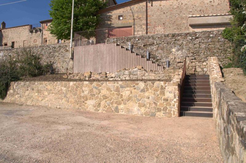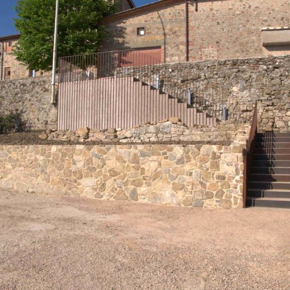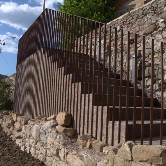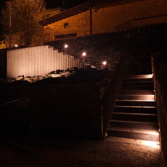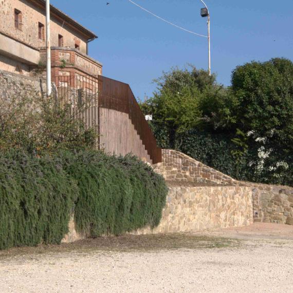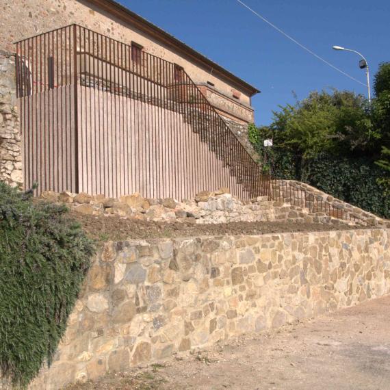 L’intervento ha riguardato la riqualificazione e valorizzazione dell’area di accesso al borgo storico, attraverso la realizzazione di un nuovo sistema di collegamento tra la zona di sosta e il centro abitato. È stata realizzata una scala in cemento armato con rivestimenti in pietra locale e acciaio corten, progettata per integrarsi con le mura storiche esistenti e inserirsi nel contesto architettonico con materiali e tonalità coerenti. L’opera è stata studiata per ridurre al minimo i movimenti di terra e per garantire sicurezza e fruibilità anche nelle ore notturne mediante illuminazione integrata. Contestualmente è stato eseguito l’intervento di recupero dei servizi igienici pubblici, con l’abbattimento delle barriere architettoniche attraverso la realizzazione di una nuova rampa a norma e l’adeguamento degli spazi interni, assicurando piena accessibilità. Un intervento che ha migliorato la connessione tra gli spazi pubblici e il borgo, coniugando restauro, funzionalità e rispetto del contesto storico.